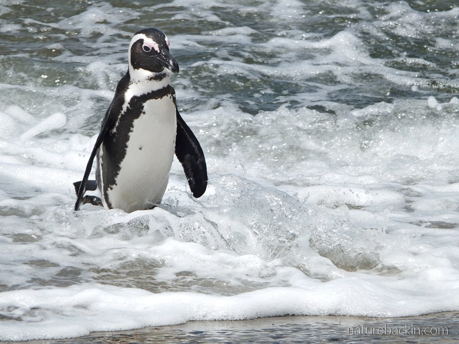 This African penguin is wading much like a human would do, as it walks out of the sea onto the sandy beach at Boulders Bay.
