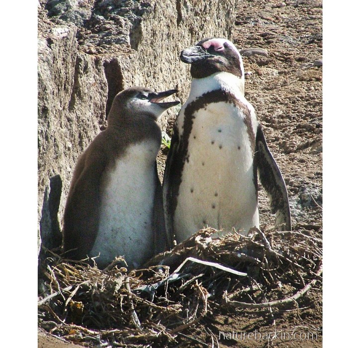 After crossing the beach at the Boulders penguin colony, we followed the path leading to a boardwalk that leads to the main nesting area. On the way we saw this parent and youngster in a nest against a rock close to the path. African penguins form monogamous pairs for life, and both parents share in incubating their eggs and in caring for and feeding the young,