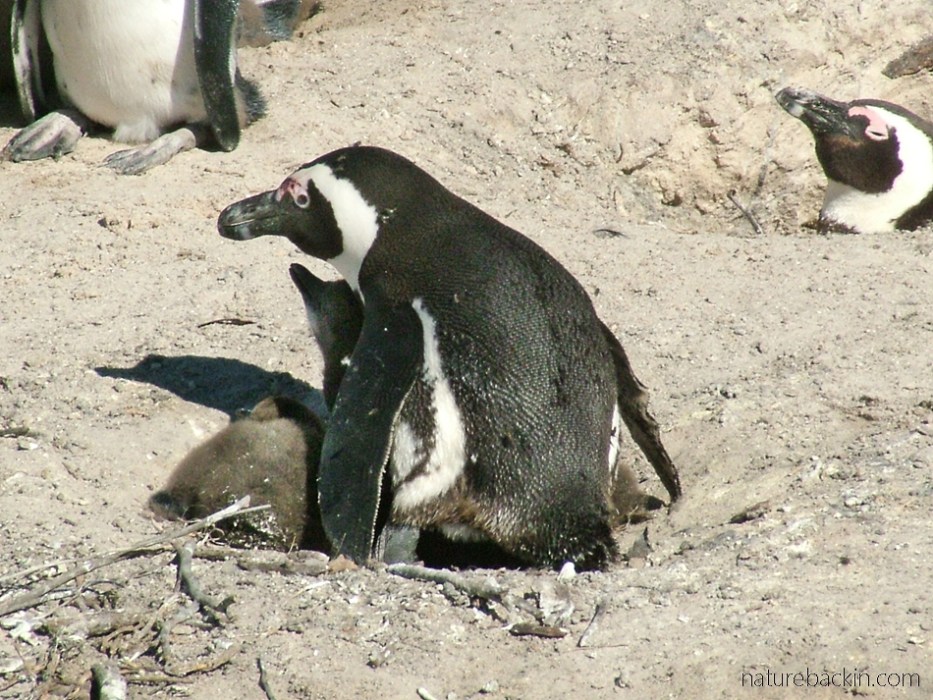 A parent bird sits in the nest, back to the sun, to provide shade to the two youngsters. At some nesting colonies, conservationists provide artificial shelters as nests in an effort to improve breeding success for the endangered African penguins. For more on the provision of such shelters see https://dict.org.za/blog/homes-for-african-penguins/