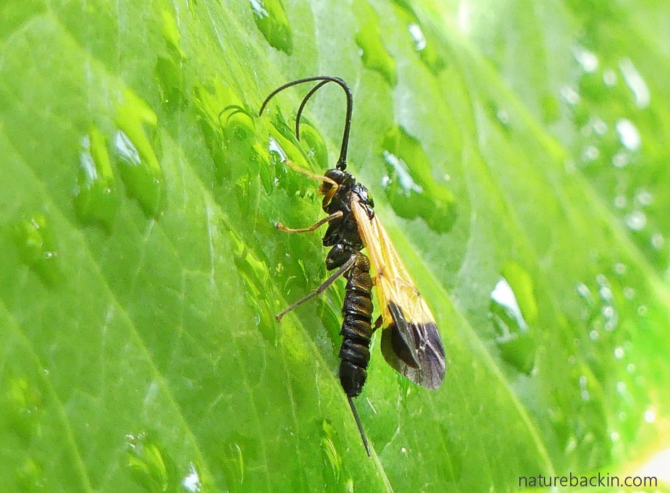 Once released it flew into an adjacent tree, which still had raindrops on its leaves. On a leaf the insect proceeded to rehydrate after its stressful time trapped inside. Seeing the spike at the end of the abdomen I thought it would be species of Ichneumon wasps, but I was surprised not to be able to identify it, so any assistance would be appreciated.