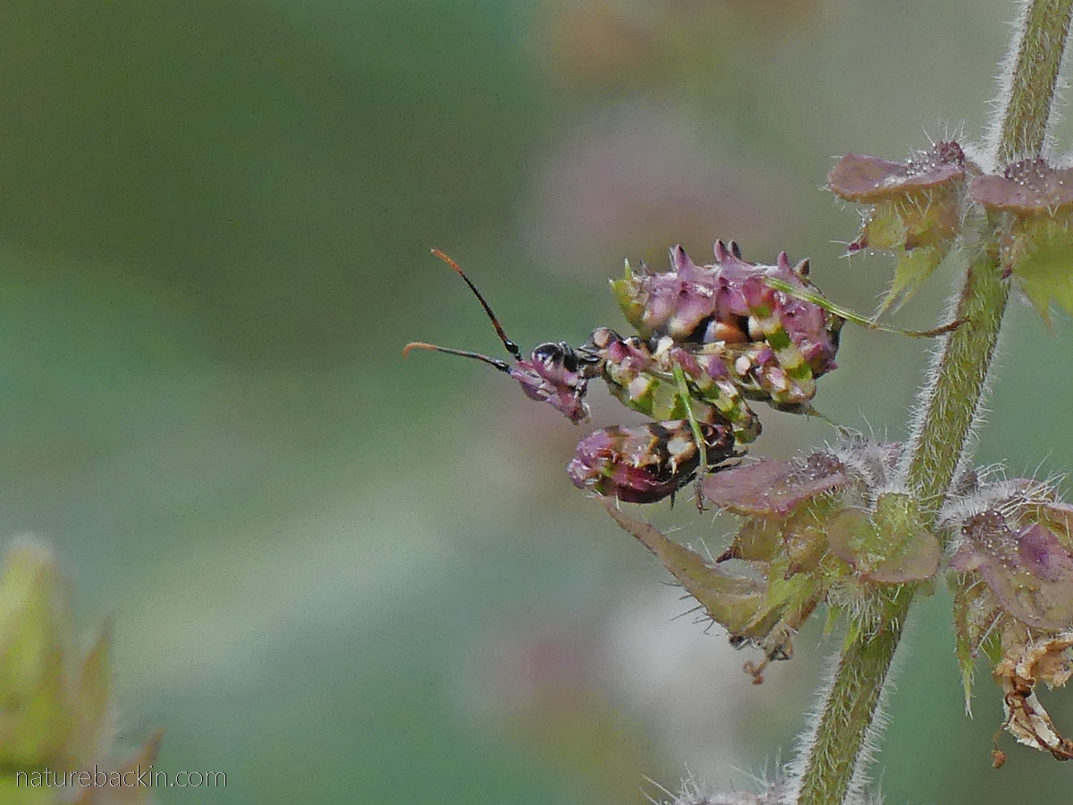 While watching a solitary bee feeding on nectar in basil flowers in the herb patch a few weeks ago, I noticed a minute spiny flower mantid nestled down on one of the flower spikes with its spiny abdomen curled up over its back.