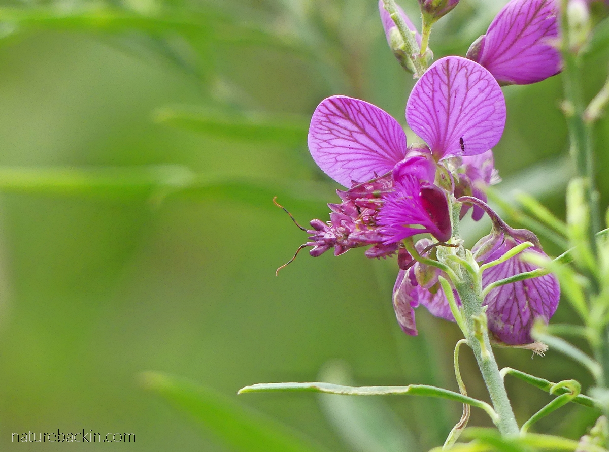 And to end, another photo of the mantid on the purple broom flowers, showing how well camouflaged it is. To a degree spiny flower mantids can adapt their colour to blend in with the flower or plant they spend the most time on. Some time back, our neighbour had a shrub known as a marmalade bush with orange flowers and a spiny flower mantis nymph hung out there and adapted its colour to a deep orange to blend in with the flowers.
