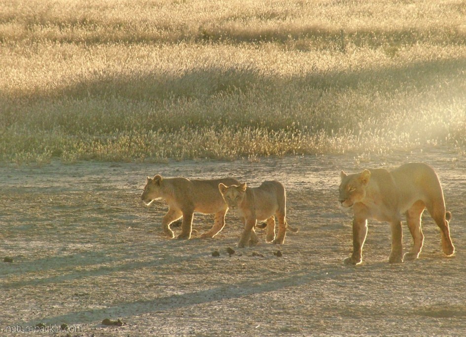 A lioness and two cubs backlit at sunrise at the Kgalagadi Transfrontier Park