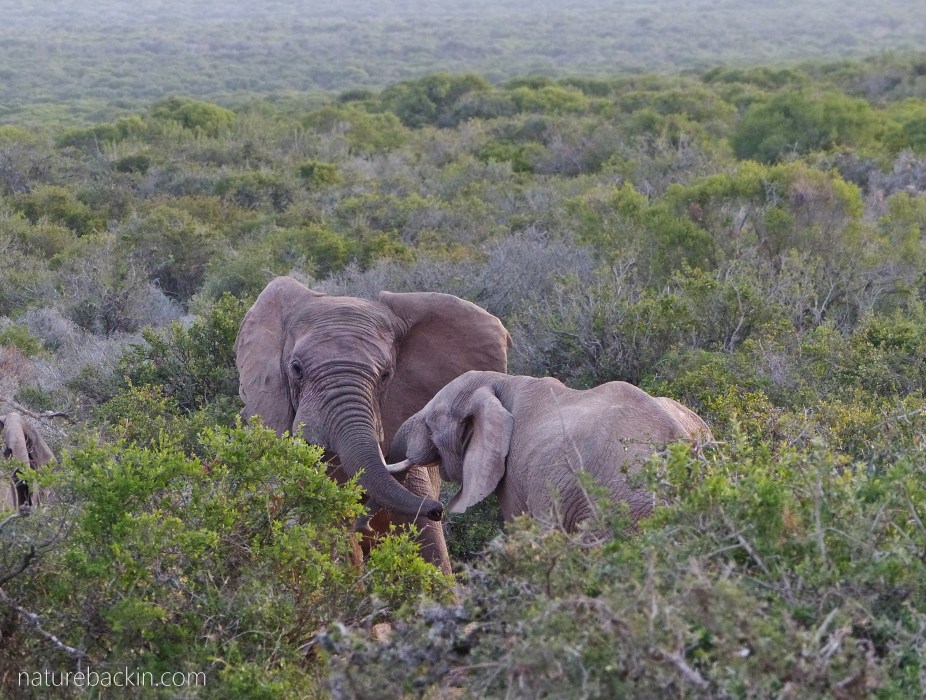In the top photo an elephant and youngster are approaching a group of elephants at a waterhole, and in the photo below two elephants are greeting in an expanse of bush at the Addo Elephant National Park.
