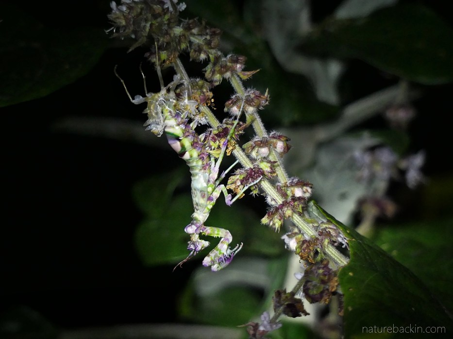 Mostly the mantids were quite sedentary. In the early mornings they would often sun themselves, moving into shade as the sun got hotter. In the early mornings I would sometimes see them climbing up flower stems to be near the top where they would turn and face downwards, which seemed to be their favourite hunting posture. I did not spend time watching them at night, but I expect that they would remain active hunters at night, although even then they would likely be sedentary hunters, ambushing unsuspecting insects that visited the flowers to feed.
