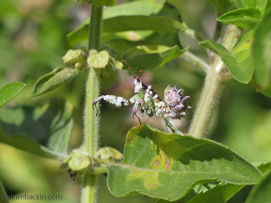 From March to July this year we were able to observe several spiny flower mantids nymphs in the basil bush in our herb garden. The basil bush was their home and hunting ground for four months as they developed towards adulthood.