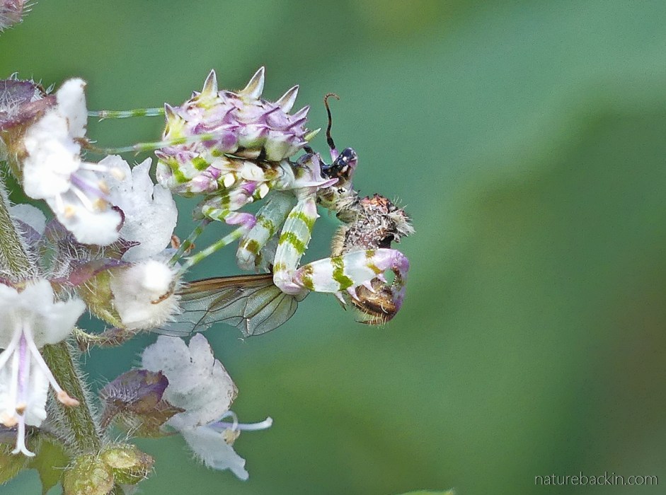 This mantid is eating a bee that it is grasping firmly with its forelegs as it eats, biting off chunks and chewing with what appears to be considerable relish