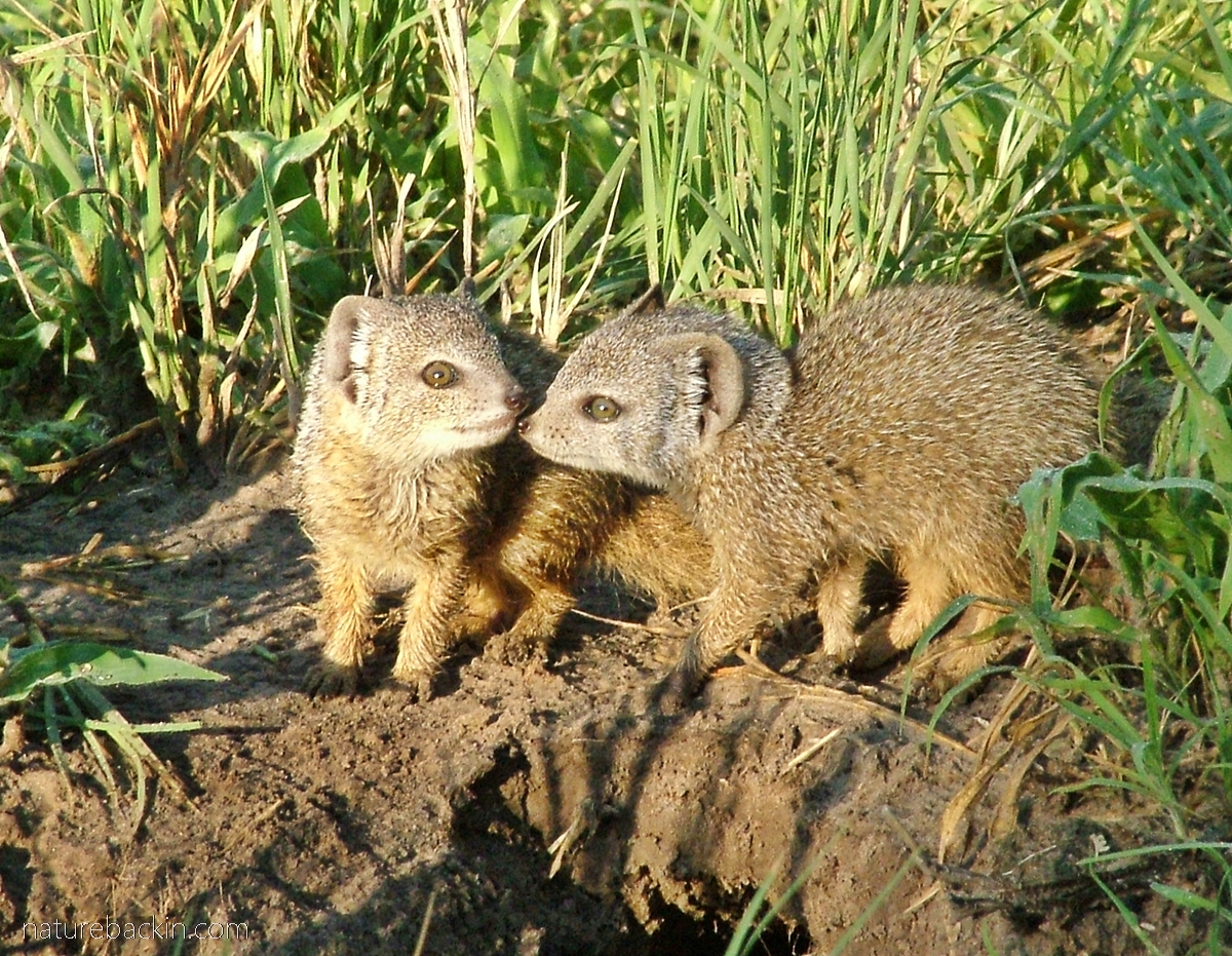 As we watched the youngsters an adult put in an appearance, perhaps checking up on the youngsters after going out foraging. Yellow mongooses have two to three pups per litter, with females producing two litters per year, so this litter of two was typical for the species.