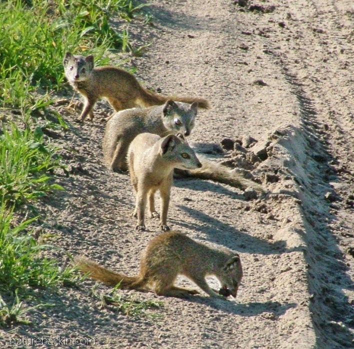 A couple of hours after tearing ourselves away from the family of yellow mongooses we came across a small group of banded mongooses (Mungos mungo). Banded mongooses tend to live in large packs, keeping in touch with almost constant twittering contact calls, and they are also pack foragers.