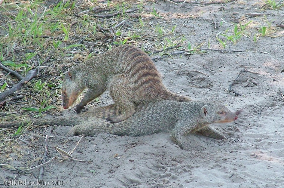 Like yellow mongooses, banded mongooses scent-mark territory and as well as members of their family and pack. We assume that the mongoose in the photo above is straddling his companion to scent mark using secretions from the anal pouch.