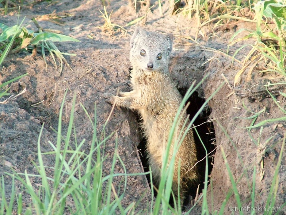 And to end, here is another photo of one of the young yellow mongooses above the entrance to the burrow. What a totally cute little predator it is!