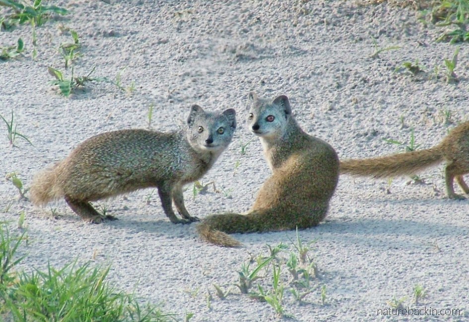 Being the only species in their genus (Cynictis), twelve subspecies of yellow mongooses have been identified. Characteristics differ across the subspecies, with those in the south west tending towards being larger in size, with longer fur and a distinctive white tip to the tail. They are also yellower in colour, although sometimes reddish. Those in Botswana tend to be greyer in colouration and they lack the white tip to the tail, which confused us mightily when we first saw them in this region until we consulted our guide book with greater attention and read that in northern Botswana the white tip to the tail is lacking. Regional colour and fur variations are such that they are also known as red or bushy-tailed meerkats.