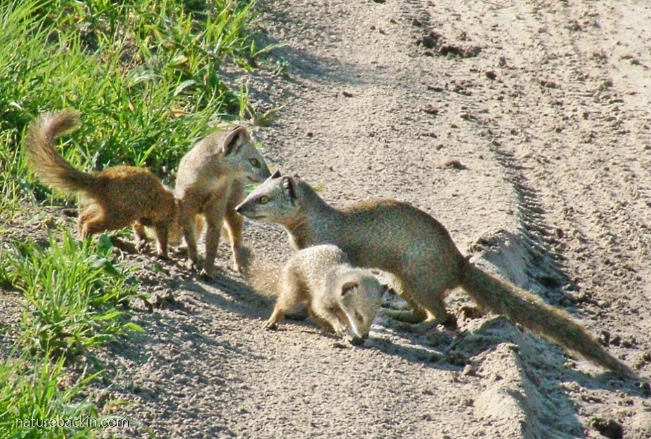 Banded mongooses seem to prefer areas with more cover than the yellow mongooses, but these emerged from the vegetation to take a sand bath on the side of the sandy road.