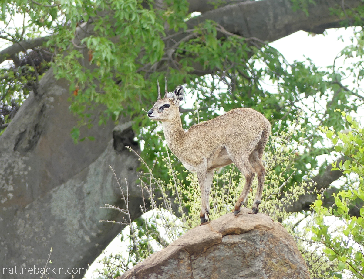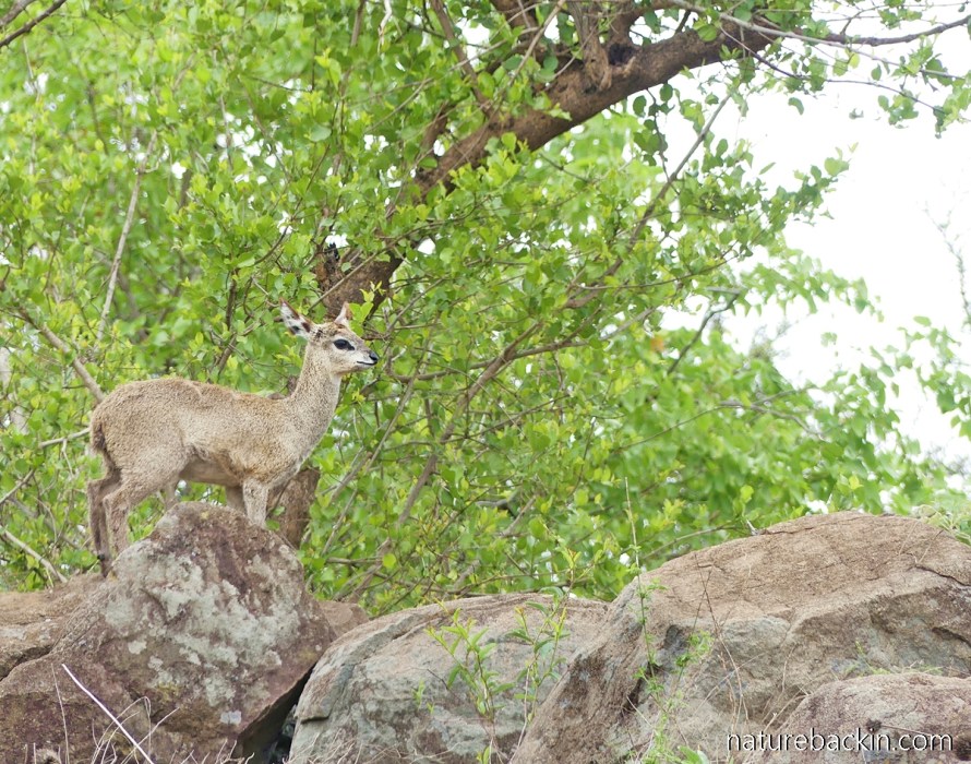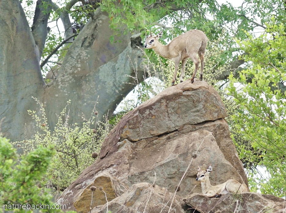 While driving through a region of the Kruger National Park punctured with with rocky outcrops strewn with large boulders we kept our eyes open for klipspringers – the name in Afrikaans/Dutch literally means ‘rock jumpers’. We were thrilled to see a male klipspringer standing on guard on a high rocky vantage point. As can be seen in the above photo he resembles a rather strategically placed statue.