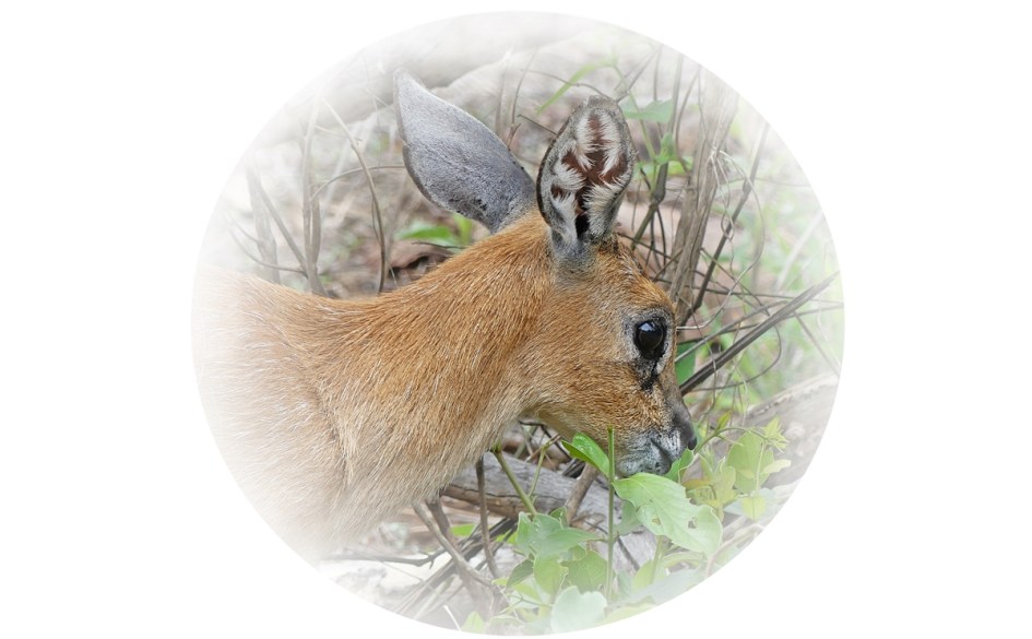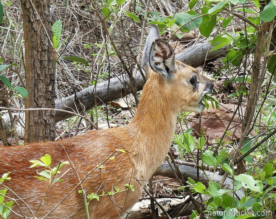 Rather than being secretive, this grysbok appeared to ignore us and continued browsing with determination. (We thought she looked pregnant and if so, she was of course eating for two!) Grysbok are mostly nocturnal, but on an overcast day this female was active even during the late morning. The diet of the Sharpe’s grysbok, as for the steenbok, in addition to browsing leaves may occasionally include fruits, fresh grass shoots and edible tubers and roots that they dig up using their hooves.