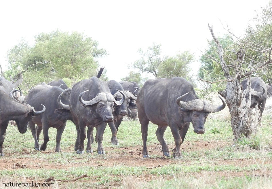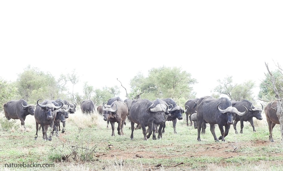 On a morning drive at Kruger National Park, seeing a large group of buffalo approaching we stopped our car to watch. They came closer and closer and then they stopped too. We had thought that we were watching them, but it turned out that they were also watching us.
