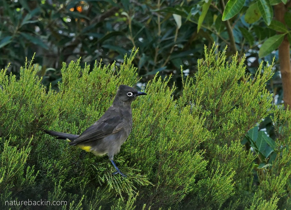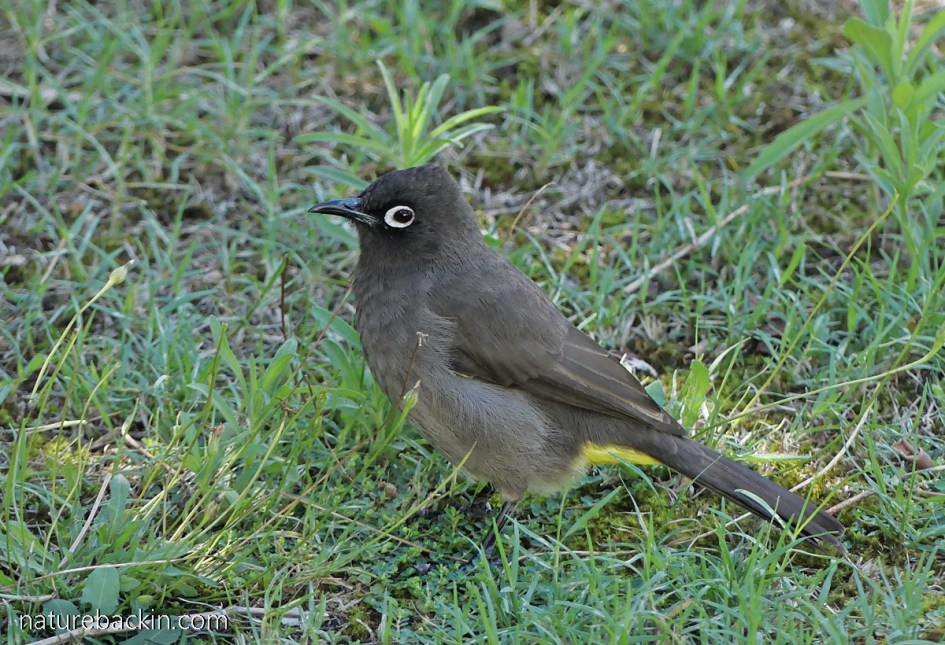 A Cape bulbul on the lawn in our new garden. The distinguishing white eye ring can clearly be seen. Like the dark-capped bulbul it also has a yellow patch under the base of the tail