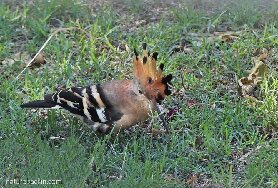 The long bill of the African hoopoe makes an excellent probe when looking for insects in soft ground. They also flick over leaves and animal dung in pursuit of mostly insect prey