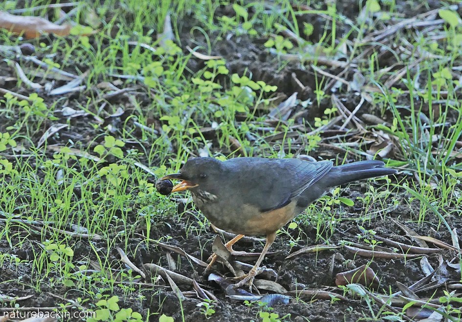 Photographed in the dim light at dusk, an olive thrush tackling a ripe fallen olive