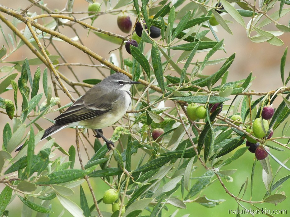 In brighter light on an overcast day while I was watching through a window, I photographed this Cape wagtail (Motacilla capensis) perched in the olive tree. Cape wagtails occur over most of southern Africa