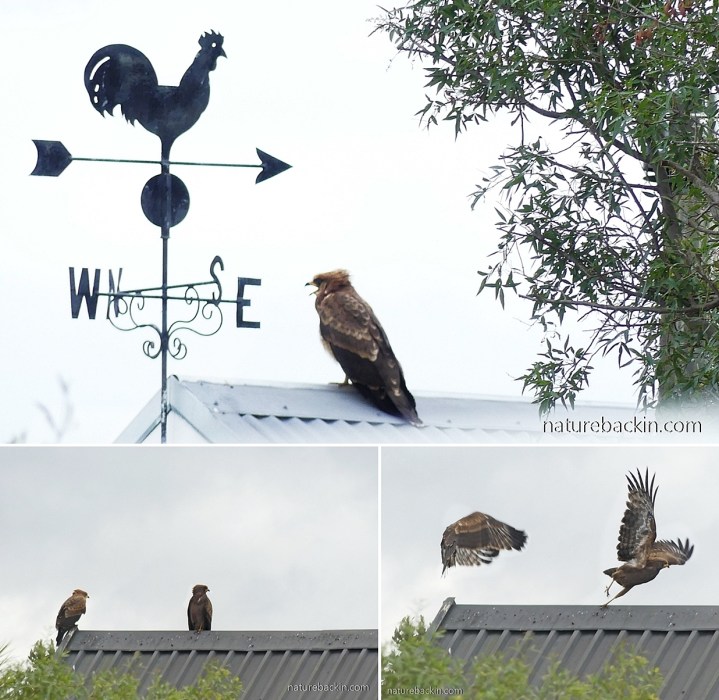 My attention was drawn to a pair of juvenile African harrier-hawks (Polyboroides typus) by their insistent whistling calling and I went outside with my camera to watch them. The one in the top photo, perched on a roof in the neighbourhood, has its bill open as it calls.