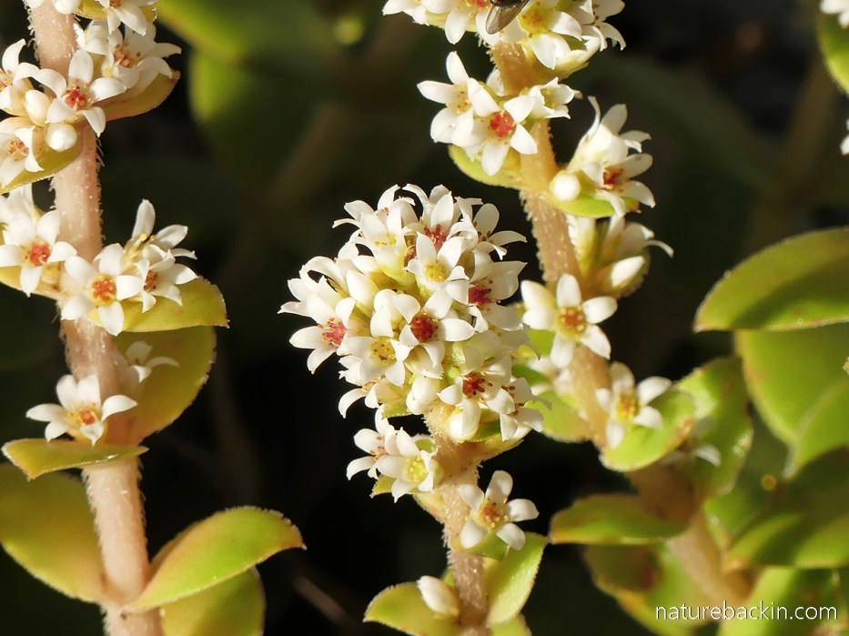 I also found some low-growing crassulas growing in small patches near the Wandelpad. This is a clump of Crassula capitella, currently in flower. Although they are known to flower in mid-to-late summer, here they are still flowering. In conditions that include sunshine and dryness, mature leaves can turn red. There are five subspecies growing wild in southern Africa (http://pza.sanbi.org/crassula-capitella).