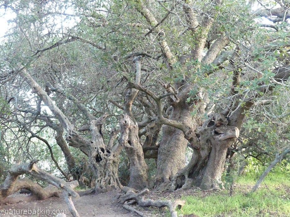 A grove of old white milkwood (Sideroxylon inerme) trees confers a high degree of gravitas on a corner of the Wandelpad. Milkwoods can live at least as long as 500 years and may grow to a height of 15 metres or so. The common name ‘milkwood’ comes from the white latex in the leaves.