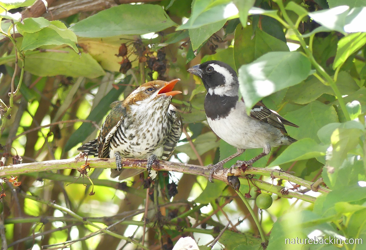 The young cuckoo was more than a little impatient, continually chirping and looking around, demanding to be fed. I stayed as concealed as possible, but looking up I saw a male Cape sparrow (Passer melanurus) watching me warily.