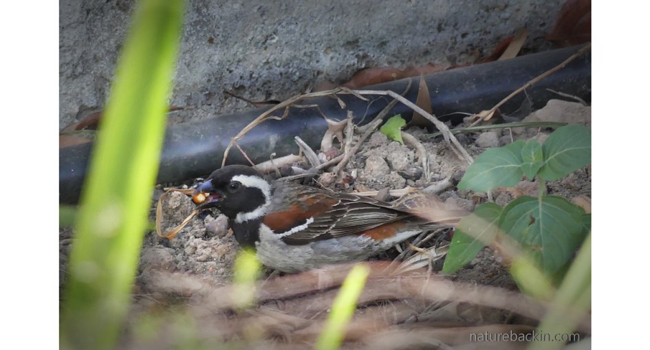 The juvenile cuckoo that I was following returned to the place where I had first seen it. I hid in a doorway and witnessed the hardworking male Cape sparrow return to feed the noisily demanding cuckoo. Strangely, there was no female sparrow in evidence.
