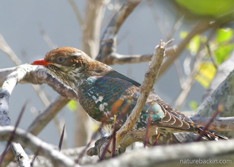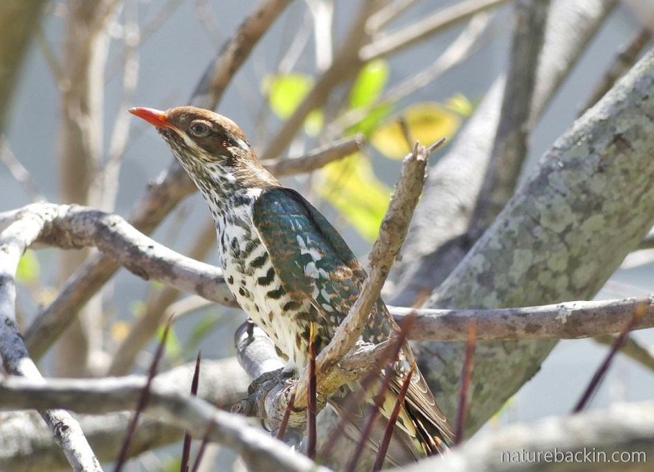I only had an enticing glimpse of its beautiful markings – streaks, dots and barring – and of its coppery head and splashes of iridescent green and copper on its back and wings before it suddenly flew off and up high into a tall tree, where it perched and resumed its plaintiff repetitive begging call.