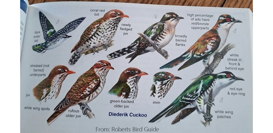 As I do not have a decent photo of adult diderick cuckoos, I took a snapshot of the illustrations showing diderick cuckoos on p.275 of the Roberts Bird Guide
