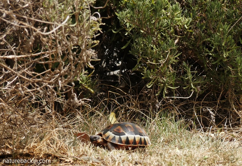 I saw this baby angulate tortoise outside the neighbouring nature reserve – it was about 5 cm (2.5 ins) long. As I was watching it, the manager of the nature reserve stopped as he was driving by. He asked me to pass it through the fence to him so that he could deposit it in the relative safety of the reserve. He said he has seen people doing the most unspeakable things to tortoises.