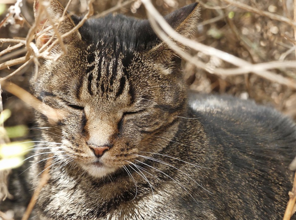 Our tabby cat Nina was fascinated by the visiting tortoise. On its first visit she sniffed it and then lay down next to it. The tortoise seemed unfazed and went about its business of eating and then moving into some shade. After several visits it decided that an old lavender bush near the gate was the perfect place to shelter from the hot sunshine.