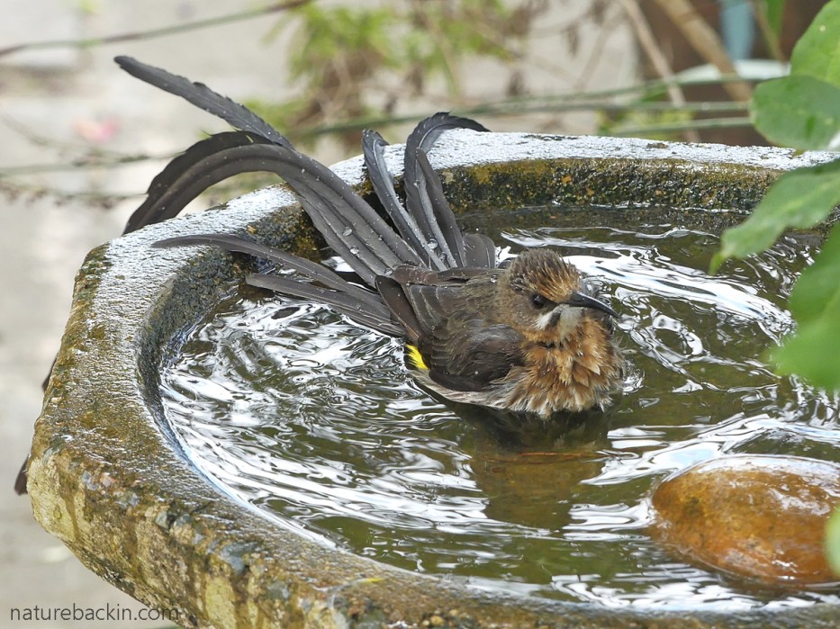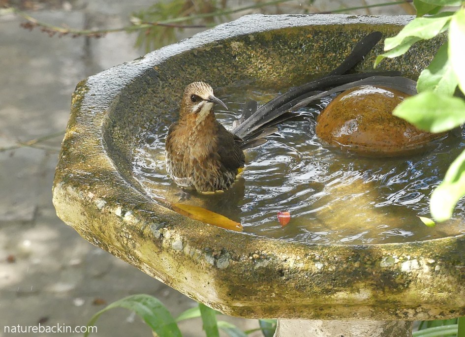 Owing to all the splashing the birdbath empties pretty quickly, but there is enough water left for this Cape sugarbird to soak its tail by vigorously shaking it in the water