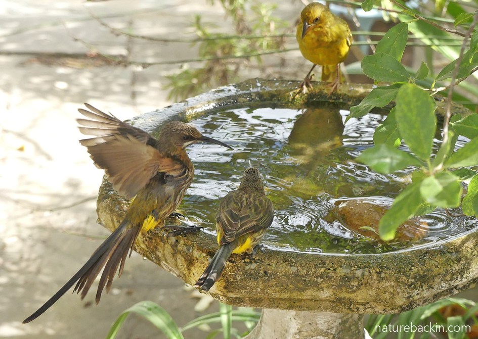 A Cape sugarbird arrives to drink, with wings still outstretched as it lands alongside another sugarbird. A weaver is about to have a drink on the far side of the bird bath