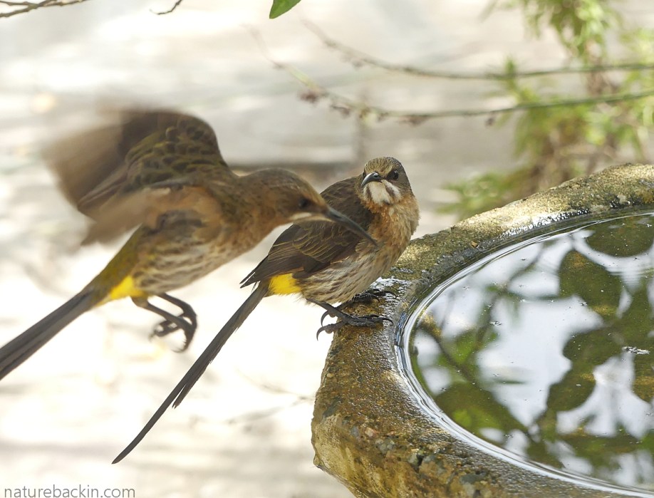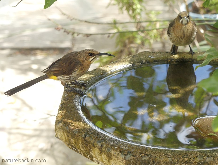 A Cape sugarbird, already at the birdbath, watches placidly as a second sugarbird arrives for a drink and a bath