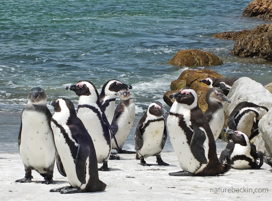 African penguins on the shore at Stony Point Nature Reserve, Western Cape, South Africa