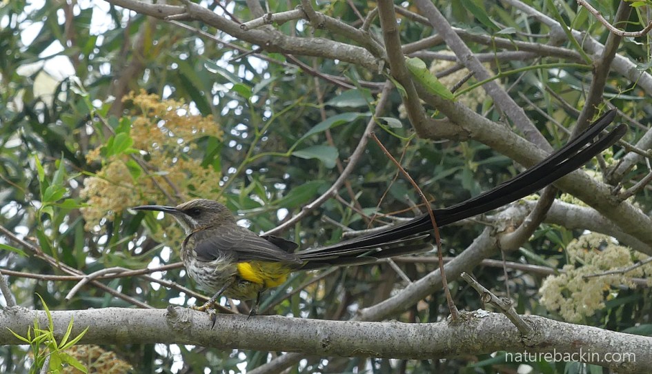 Not always apparent, is the bright yellow rump of the Cape sugarbird