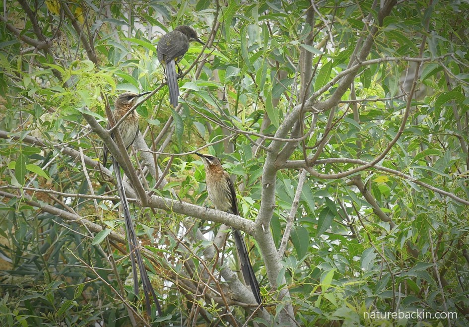 Cape sugarbirds perched in a witkaree tree (Searsia pendulina) in our garden. Females have longish tails but not nearly as long as the tails sported by the males