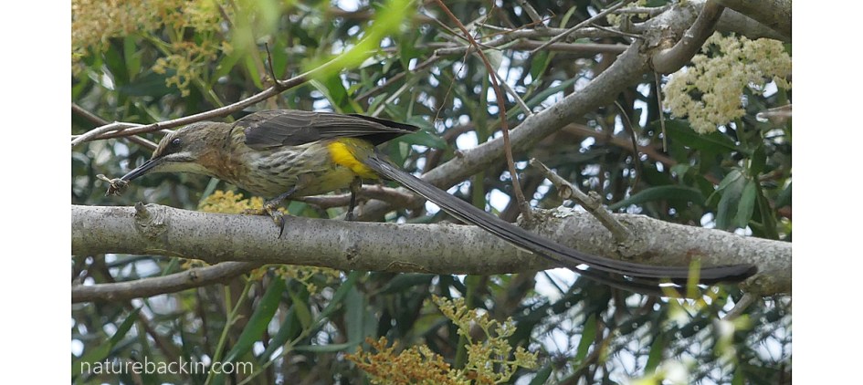 Although Cape sugarbirds take nectar predominantly from proteas, they also feed on flowers from other plants such as ericas (heaths), Cape honeysuckle (Tecomaria capensis), watsonias and kniphofias, and from some exotic species including eucaluptus and syzygium (sometimes called eugenia) trees. Over the past few months there have not been suitable flowers for nectaring available to them in our garden, but I have seen them gleaning small insects from foliage and flowers and I have also seen them wielding and then eating honeybees that they have caught.