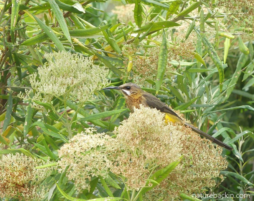 In midsummer, while the sagewoods (Buddleja salviifolia) were flowering (above), I often saw Cape sugarbirds hunting for insects in the flowers and amongst the foliage