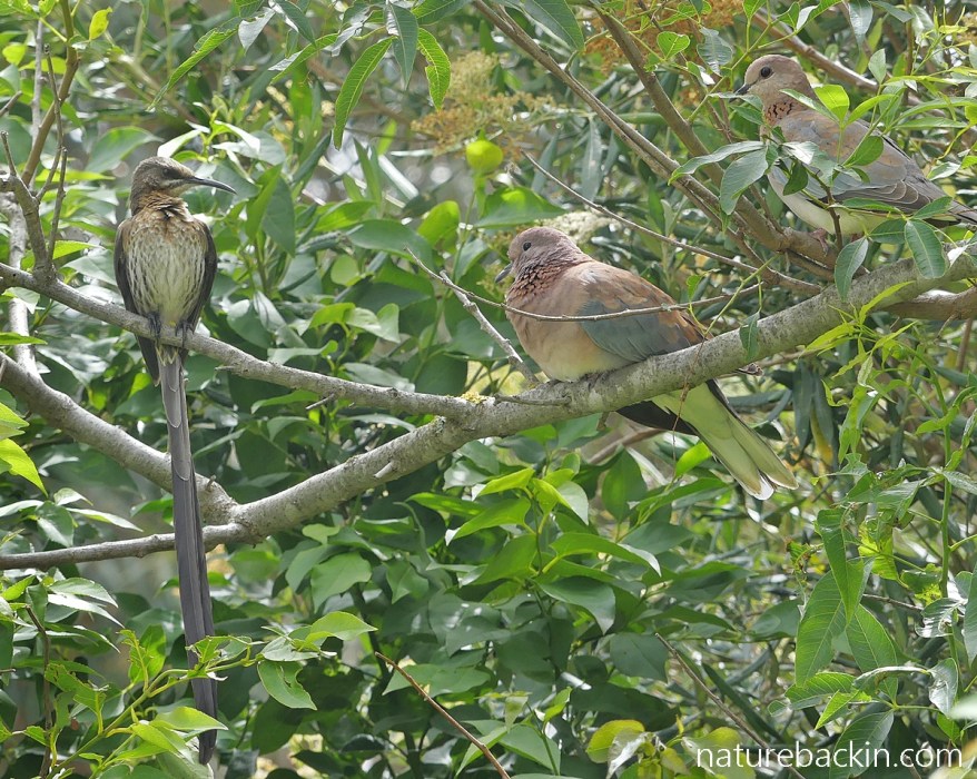A Cape sugarbird perching on a branch in our garden in the heat of the day in the company of two laughing doves (Spilopelia senegalensis)