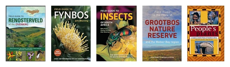 🔖Curtis-Scott, Odette. et al. 2020. Field Guide to Renosterveld of the Overberg. Cape Town: Struik Nature; 🔖Manning, John. 2018 (2nd ed.) Field Guide to Fynbos. Cape Town: Struik Nature; 🔖Picker, Mike, Charles Griffiths & Alan Weaving. 2019. Field Guide to Insects of South Africa. Cape Town: Struik Nature; 🔖Privett, Sean & Heiner Lutzeyer. 2010. Field Guide to the Flora of Grootbos Nature Reserve and the Walker Bay Region. [Hermanus]: Grootbos Foundation; 🔖Van Wyk, Ben-Erik & Nigel Gericke. 2007. People’s Plants: A Guide to Useful Plants of Southern Africa. Pretoria: Briza.