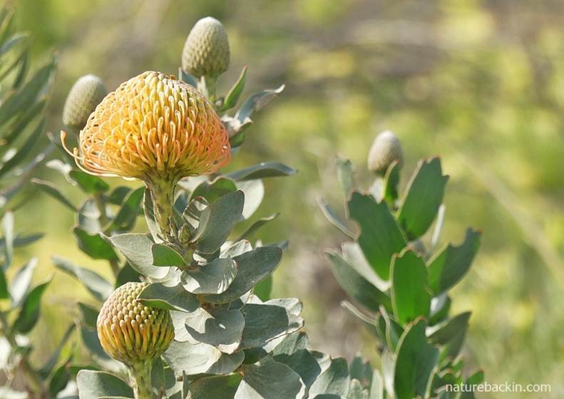 In South Africa Leucospermums (known as pincushions), belonging to the Proteaceae family, are popular as garden plants. The plant in the photo above is growing in the wild and is most likely a Leucospermum cordifolium. In the wild the plants are pollinated by protea scarab beetles and by nectar-feeding Cape sugarbirds and three species of sunbird. The nut-like seeds are collected by ants that carry them to their burrows. The seeds are effectively stored underground and only germinate after fire. Hybrids and cultivars of Leucospermums are farmed in several countries and regions, including in Israel, California, Hawaii, Zimbabwe, Australia and New Zealand, for the cut flower trade.