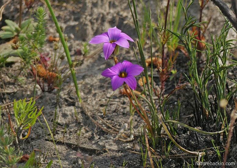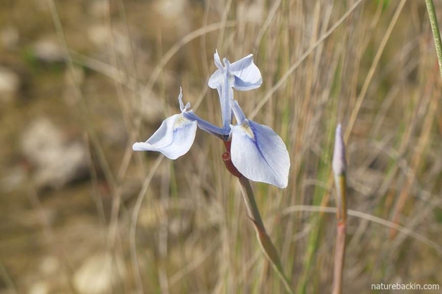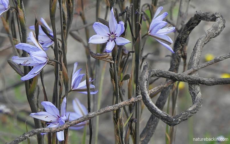 Pale Capeblue (Aristea spiralis), also known as star-eyed aristea, is another member of the Iridaceae family. The beautiful flowers range in colour from white to pale blue. Pale Capeblues flower particularly well after fire. In the wild these plants often grow in clumps, so even though each flower lasts for less than a day, those in clumps have a succession of flowers during the months of spring. The clump in the above photo is surrounded by branches of a fire-damaged shrub.