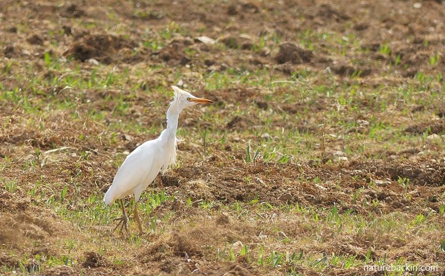 I regret that I did not take a photograph of the farmer driving a tractor that was towing a tilling implement to clear a field. This activity attracted several birds hoping to prey on insects, including this windswept western cattle egret (Bubulcus ibis). These birds commonly follow large animals, such as cattle, hoping to catch insects that are disturbed by the animals as they graze, hence the name “cattle egret”. In this case, from the bird’s point of view, the tractor was fulfilling a similar function to grazing cattle.