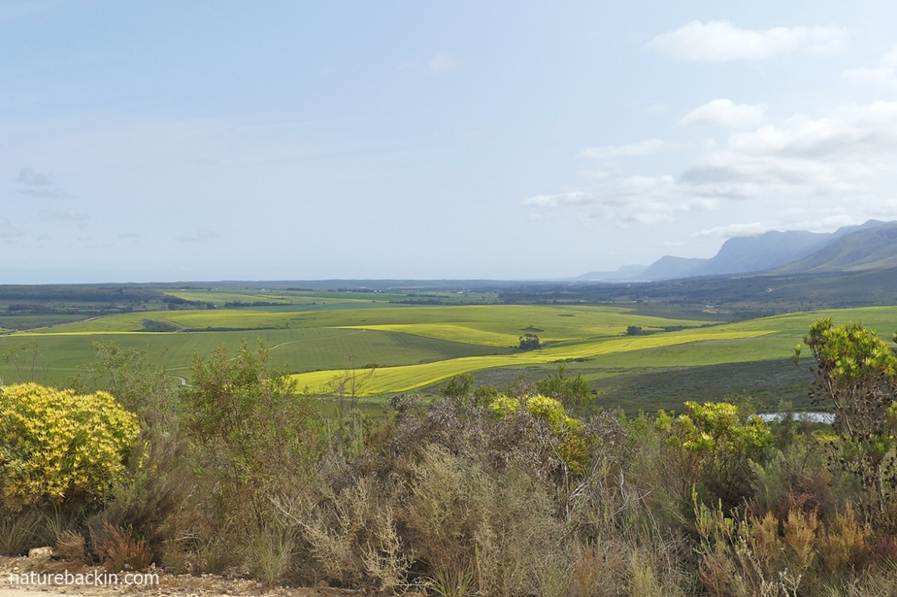 From this ridge we had a great view over the shrubby fynbos bushes (including the yellow Leucadendrons in the foreground), down to the farmlands and canola fields and towards the Klein River Lagoon and the sea. The Klein River mountains can be seen in the distance on the right.