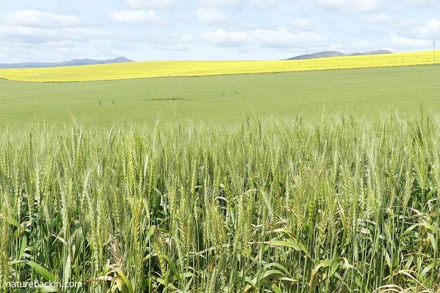The farm road curved past fields of flowering canola and wheatfields that looked nearly ready for harvesting. Birds used the fences and posts as convenient perches, convenient also for us to photograph them from our car windows. The header photo is of a pipit, most likely the African pipit (Anthus cinnamomeus), perched on a fence post, with the flowering canola forming a bright yellow background.