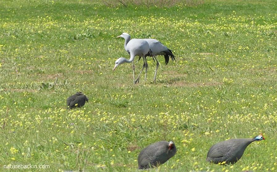 We left the farm road and returned to the main road, from where we spotted these two blue cranes (Grus paradisea) accompanied by helmeted guineafowls (Numida meleagris). We turned off onto another farm road to get a closer look, and then we decided to see where the road took us. As the road climbed up to a ridge, we saw a signboard identifying the land on the high ground as the Sugarbird Nature Reserve.