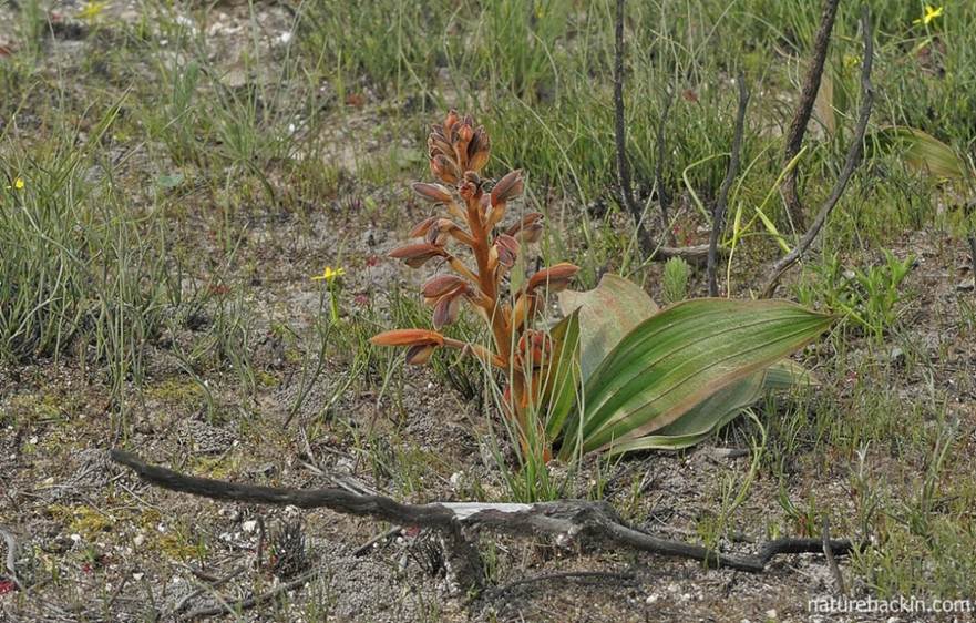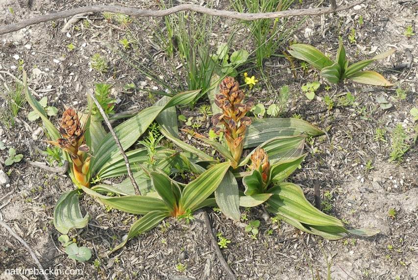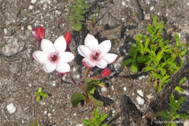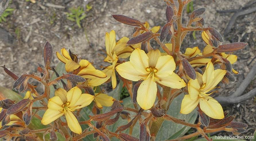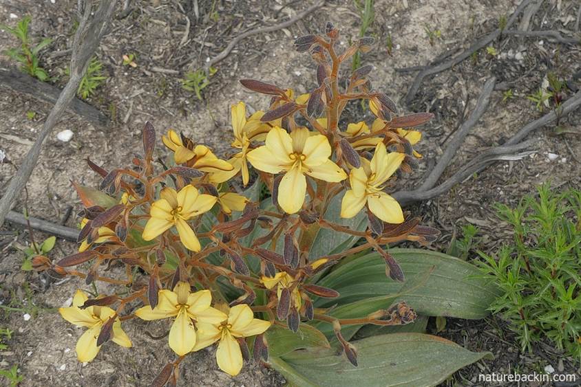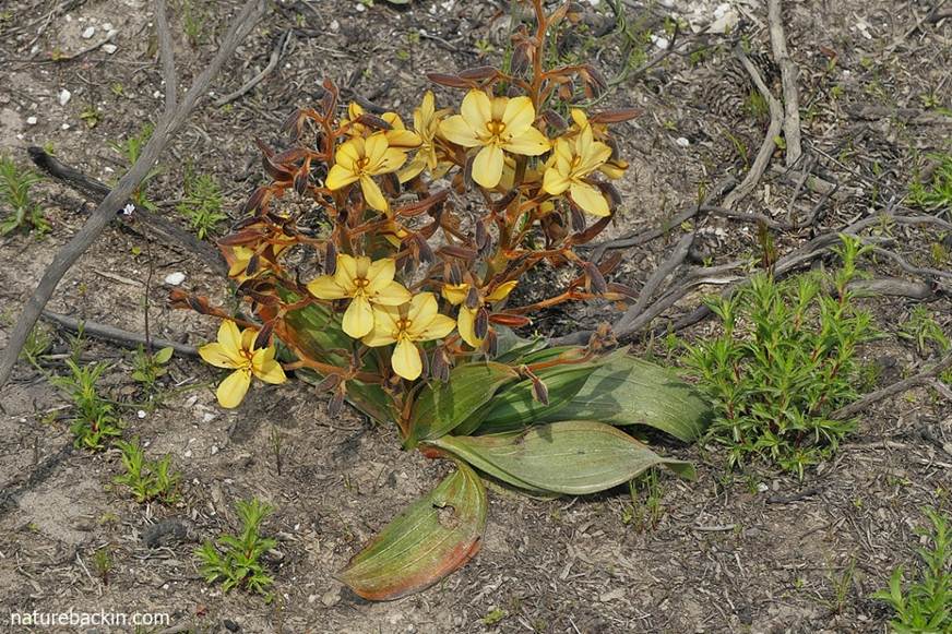 Common Butterflylily (Wachendorfia paniculata) is a strange and beautiful plant. In the above photo the broad pleated leaves of this winter-growing deciduous plant are clearly visible. Sprouting from the base is an upright stem bearing flower buds. This is another species that does particularly well after fire.